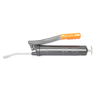 黄油枪是一种给机械设备加注润滑脂的手动工具。它可以选装铁枪杆(铁枪头)或软管(平枪头)加油咀。对加油位置方便处于空间宽敞的地方可用铁枪杆(铁枪头),对加油位置隐蔽,拐弯抹角的地方就必须用软管(平枪头)来加油。本品具有操作简单,携带方便,使用范围广的诸多优点,是广大农机手,维修中心的必备工具。