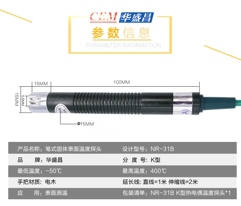 华盛昌CEM K型专业温度探头(-50℃~400℃,延长为1米) 1个
